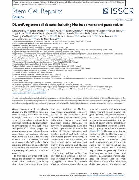 Dajani, R.; Pereira de Melo, H. et al. Diversifying stem cell debates: Including Muslim contexts and perspectives. Stem Cell Reports, 2022 [CS 11.6, 91st, 27/328 Genetics] [CS 2023 10.5], 17(5), pp. 1019–1022.