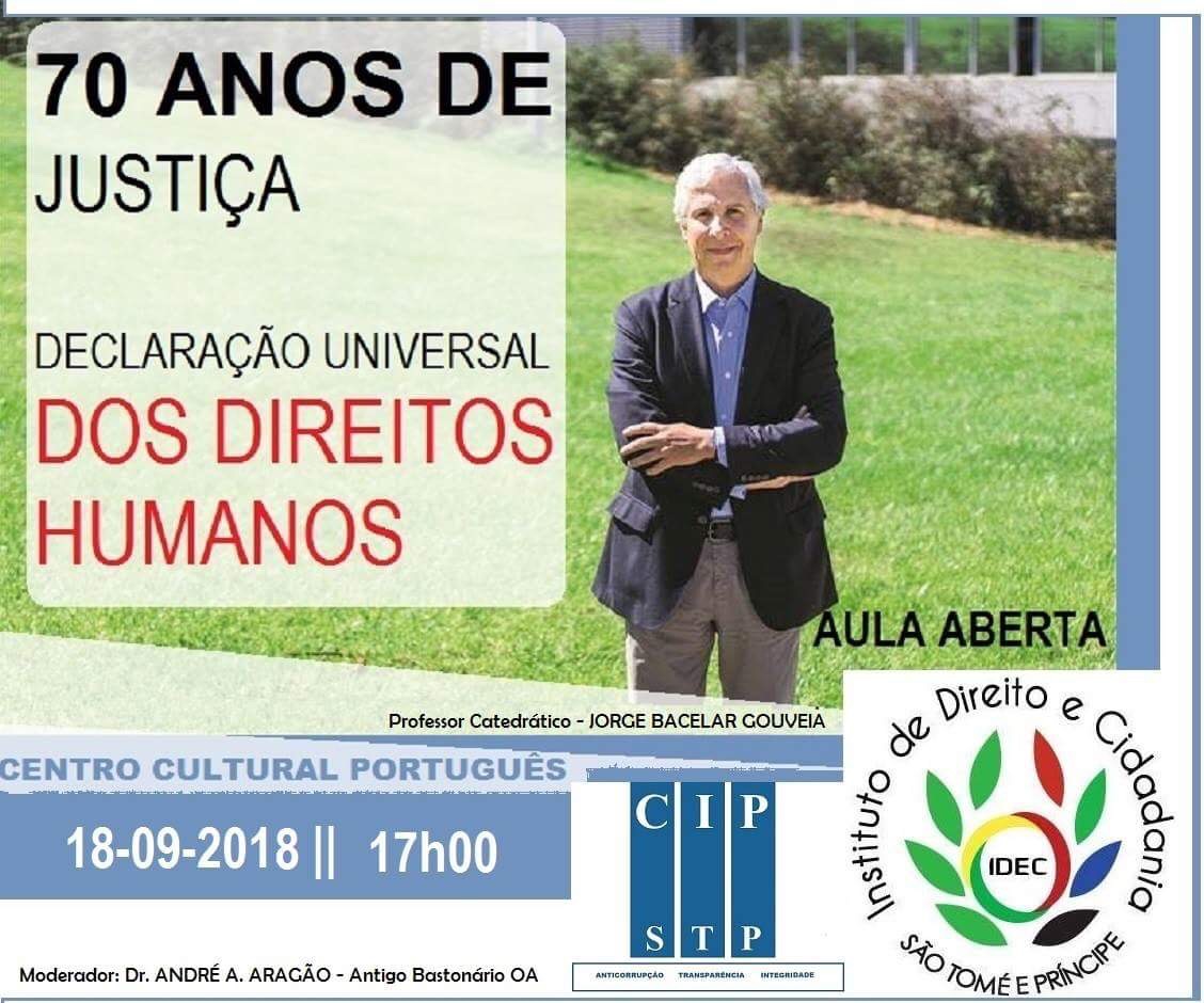 No dia 18 de setembro, o nosso Investigador, o Professor Doutor Jorge Bacelar Gouveia, irá apresentar uma aula aberta no Centro Cultural Português, em São Tomé (São Tomé e Príncipe) com o tema 70 anos de justiça: Declaração Universal dos Direitos Humanos.