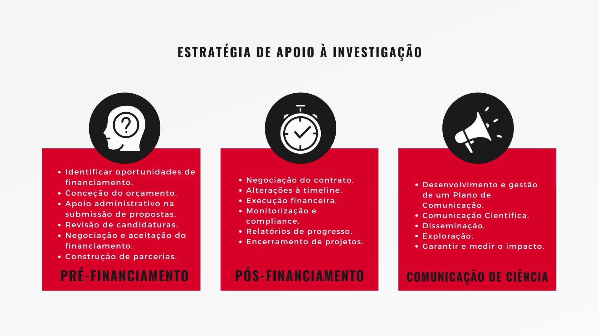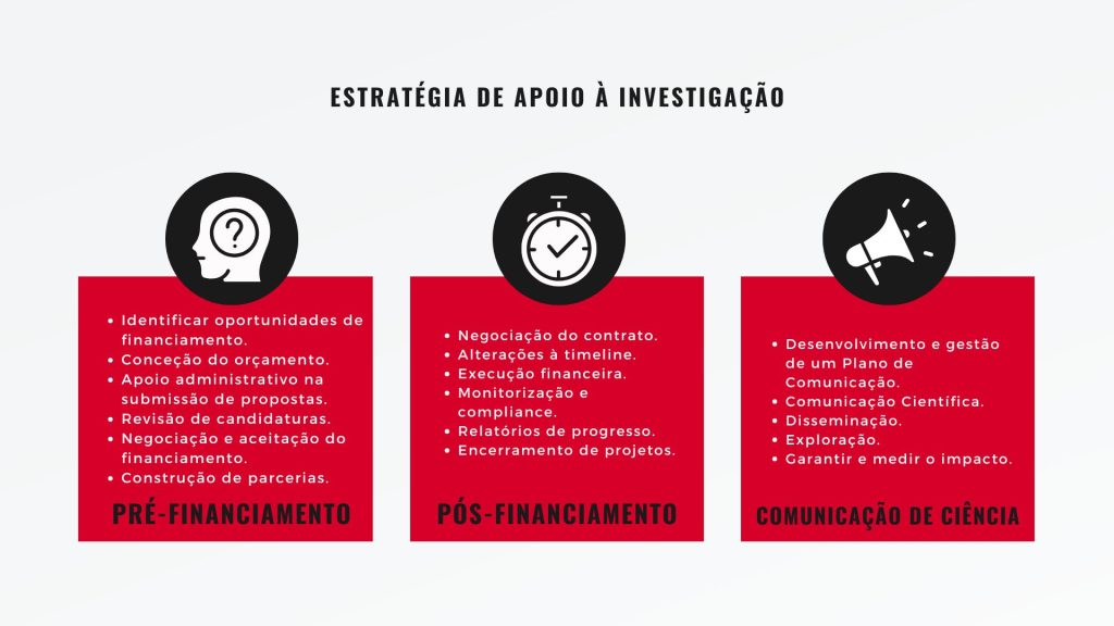Este gabinete desempenha um papel fundamental no apoio à nossa comunidade, colaborando ativamente para garantir o financiamento necessário ao desenvolvimento de projetos de investigação, seja através de fontes nacionais ou internacionais, prémios ou outras formas de apoio financeiro. Além disso, assume a responsabilidade de sistematizar e preparar os dados relevantes para a divulgação dos resultados da investigação, promovendo a visibilidade do sucesso científico da instituição e dos seus investigadores.