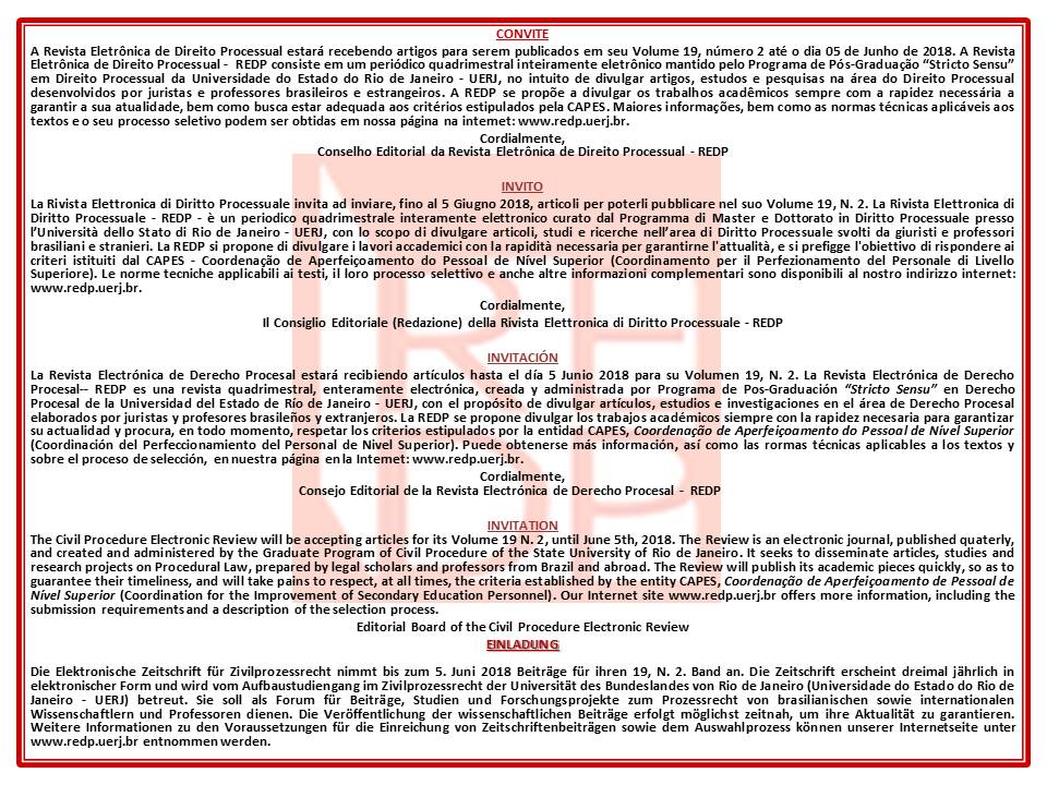 • Até 5 de junho, está aberto o prazo para o envio de propostas de artigos para o volume 19, n.º 2, da Revista Eletrônica de Direito Processual. Mais informações no ficheiro em anexo.