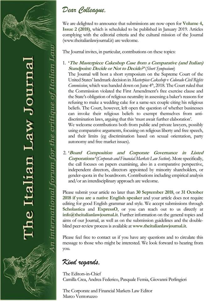 - Até 30 de setembro, encontra-se aberto o prazo para a submissão de artigos para a revista The Italian Law Journal. Mais informações, no ficheiro em anexo.