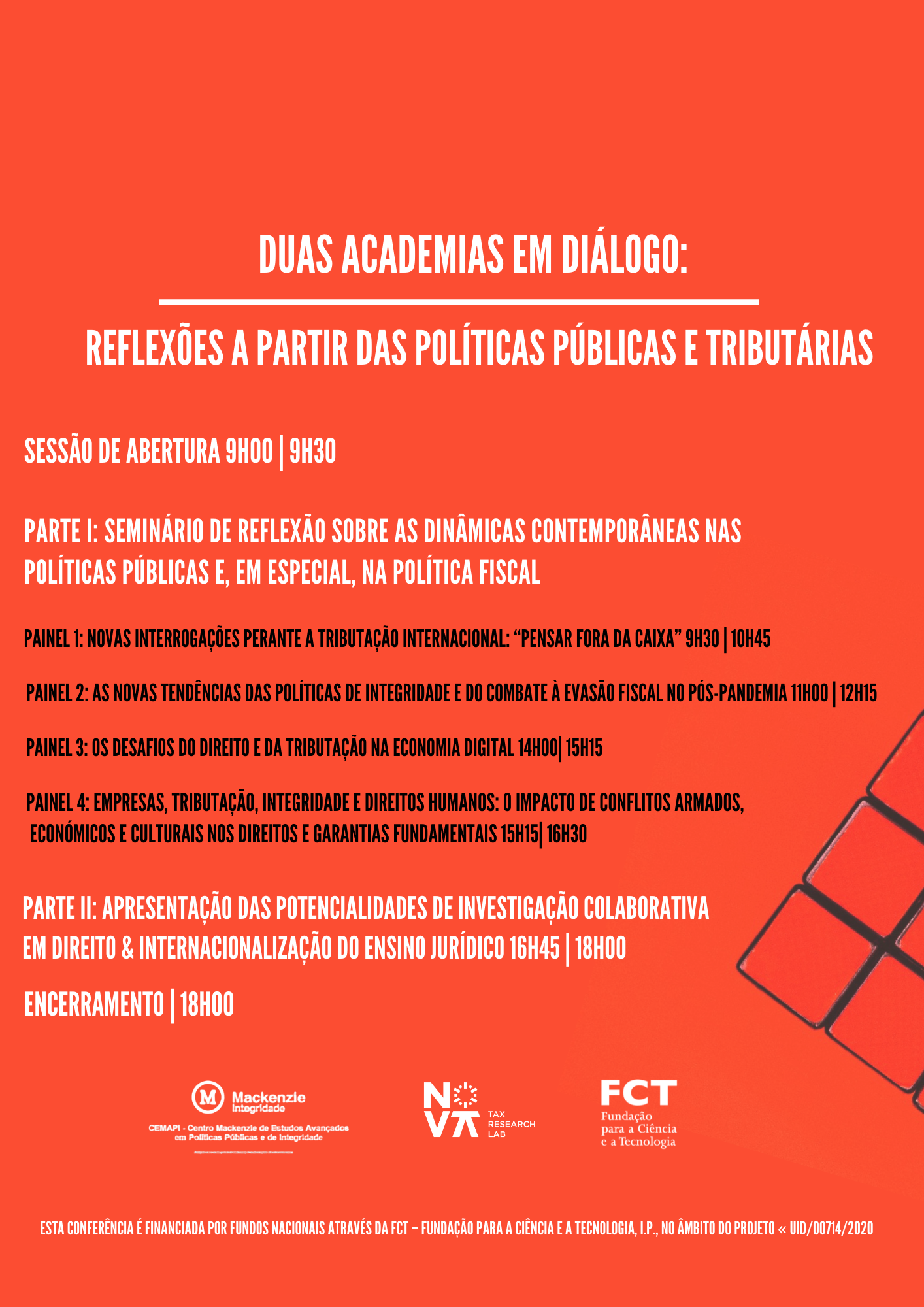 The event will provide a space for reflection on some of the most pressing issues in the universe of public policy and taxation, and aims to initiate the bonds of potential collaborative research between the two organizing research centers, making researchers, collaborators, and lines of thought known.