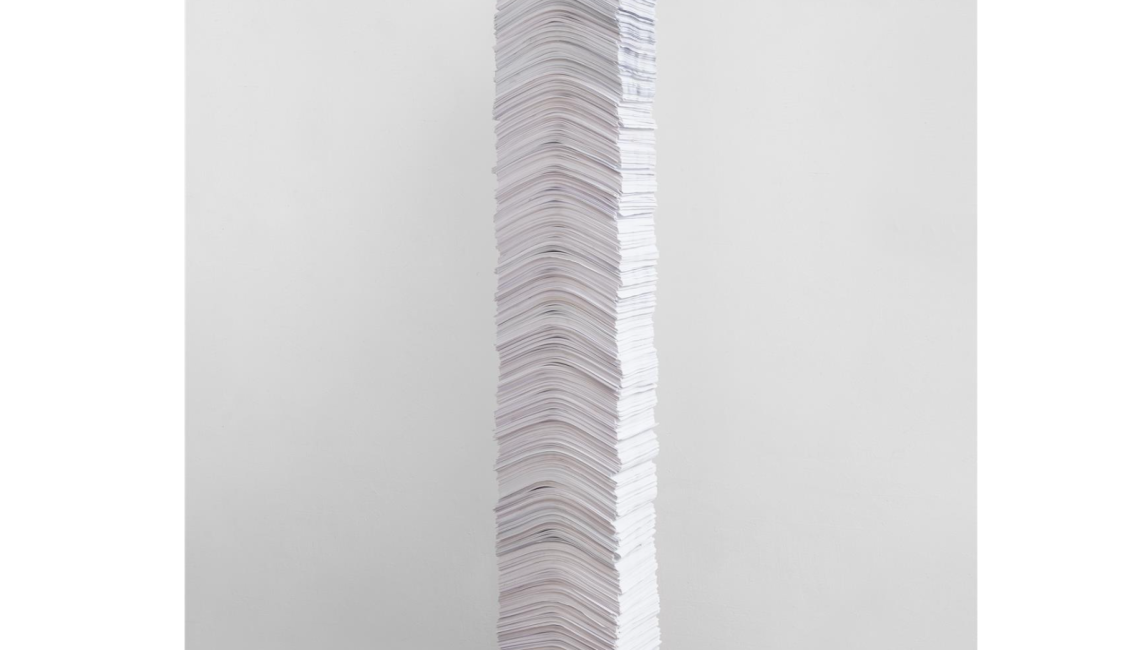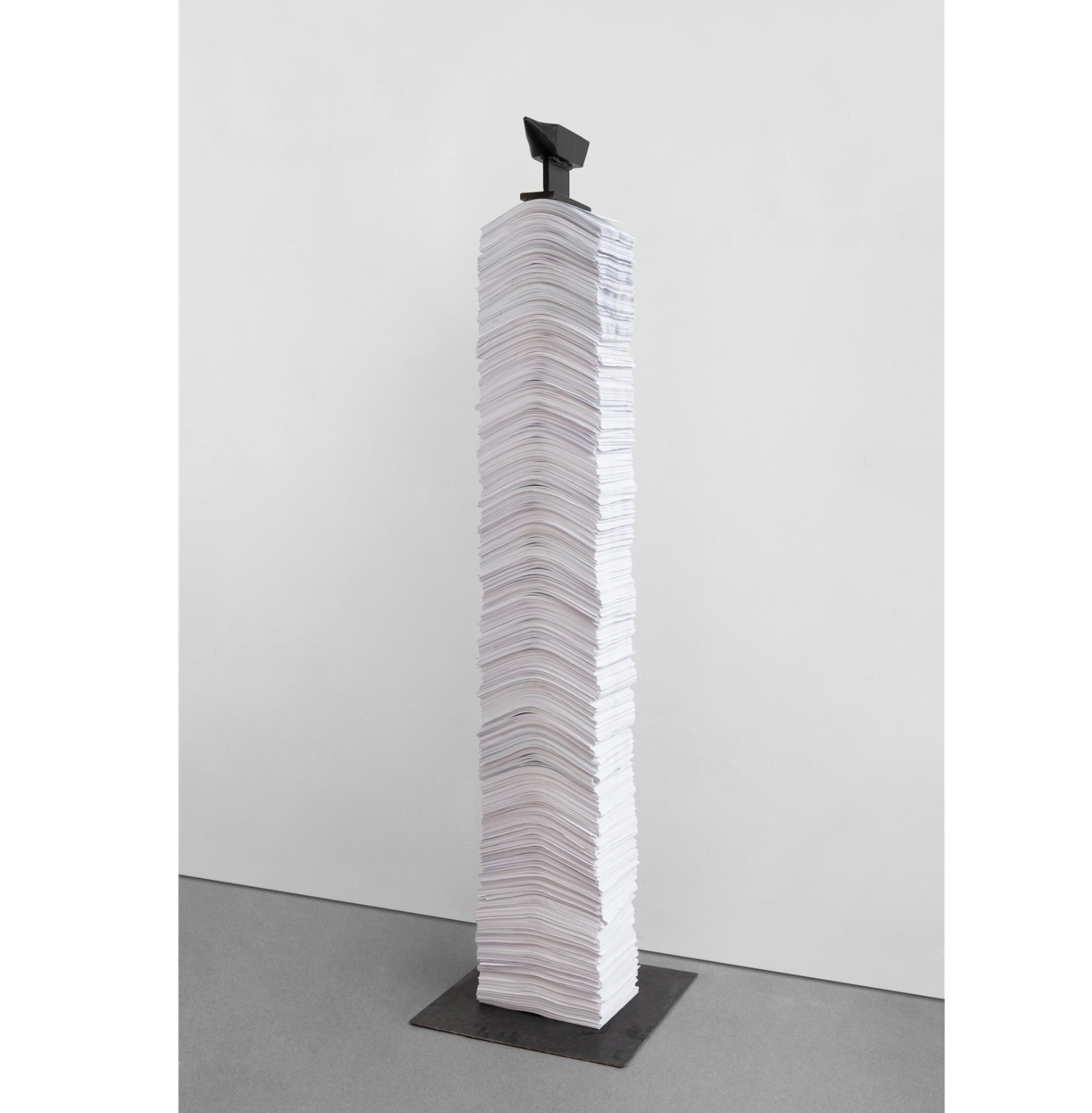 Monument to Kafka, 2022. 10,000 pages of legal proceedings from the European Court of Human Rights implying human rights violations. Iron, anvil, and paper.