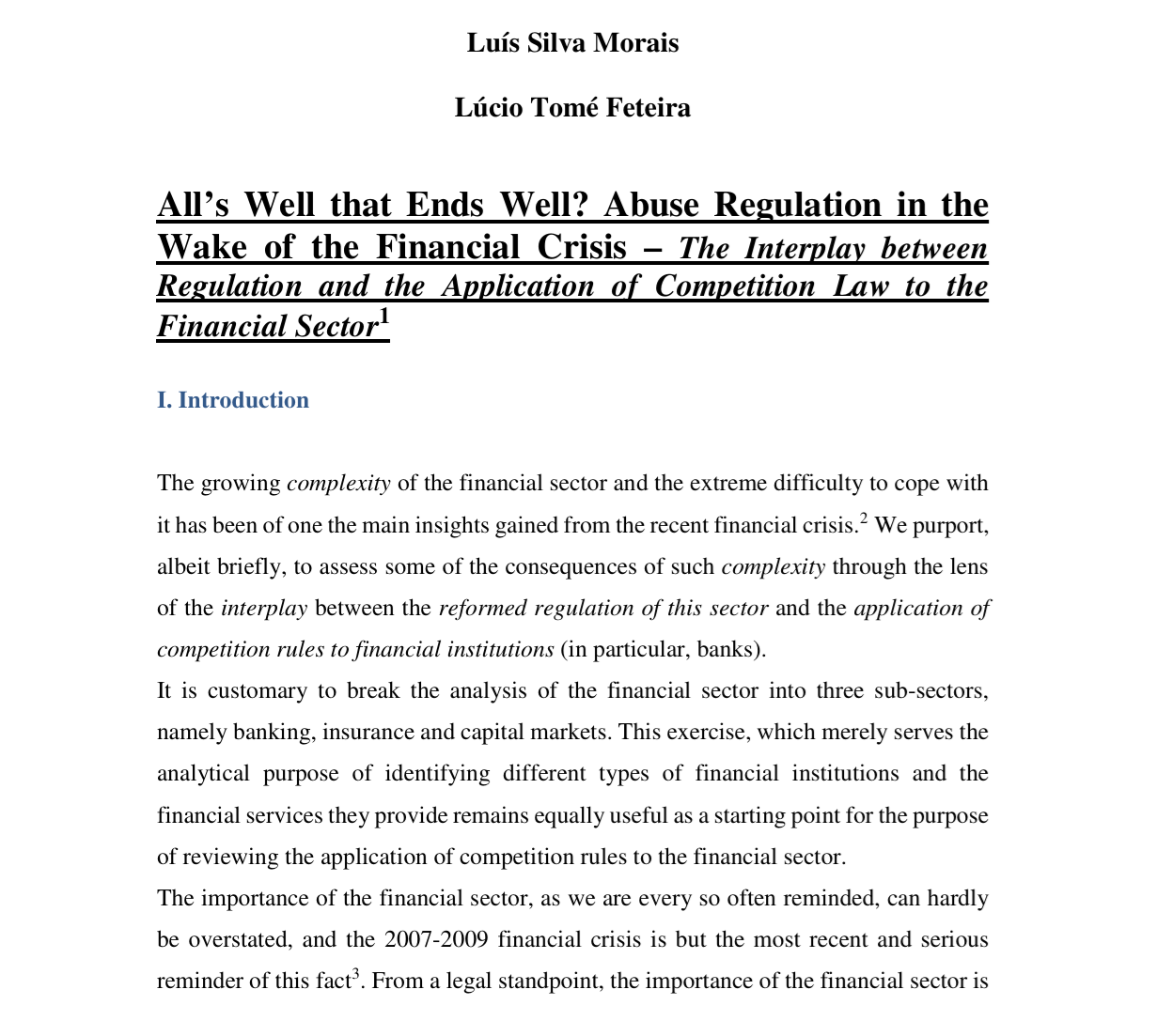 Morais, Luis Silva and Feteira, Lúcio Tomé, All’s Well that Ends Well? Abuse Regulation in the Wake of the Financial Crisis – The Interplay between Regulation and the Application of Competition Law to the Financial Sector (February 2, 2018). Available at SSRN: https://ssrn.com/abstract=3120376 or http://dx.doi.org/10.2139/ssrn.3120376