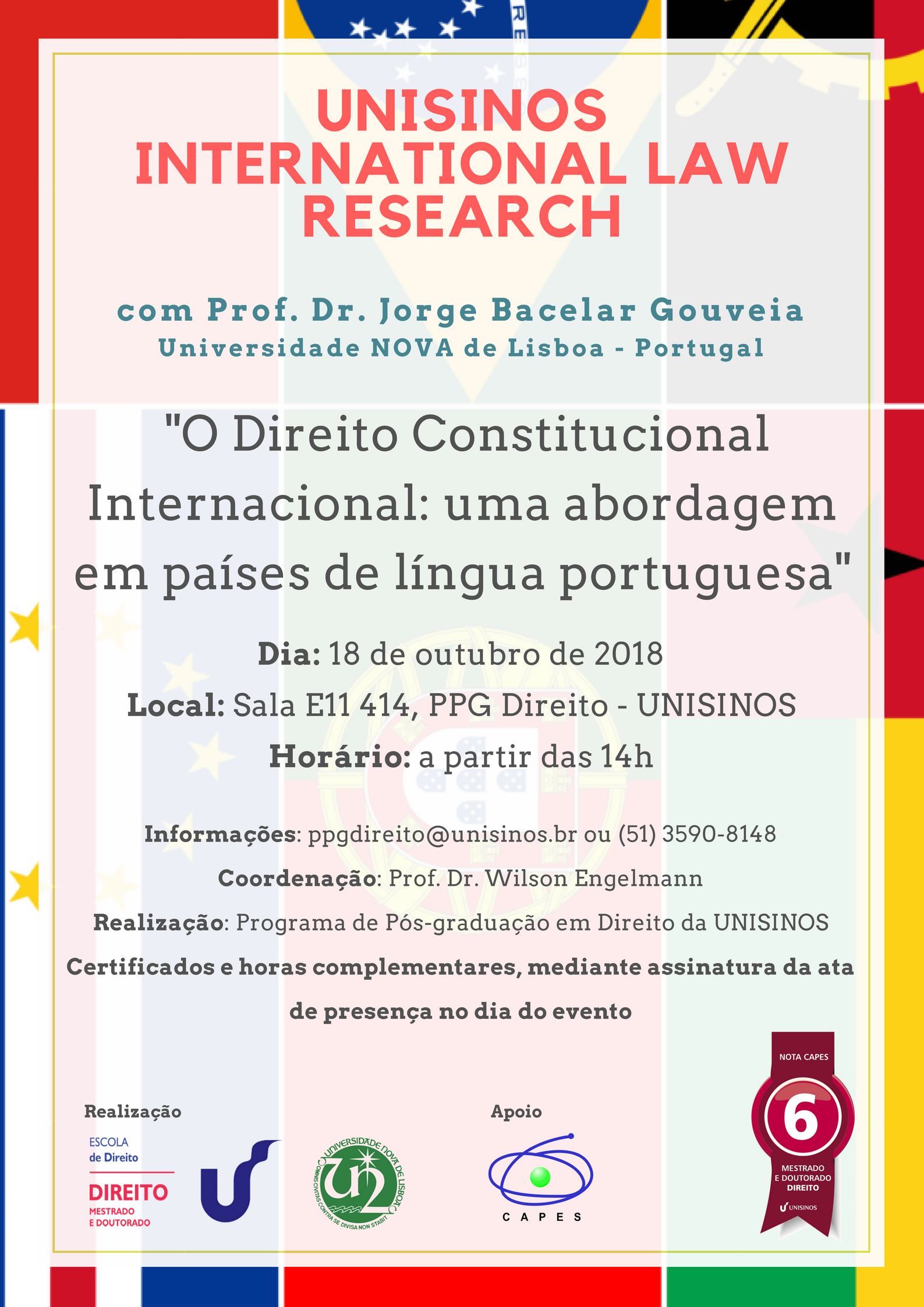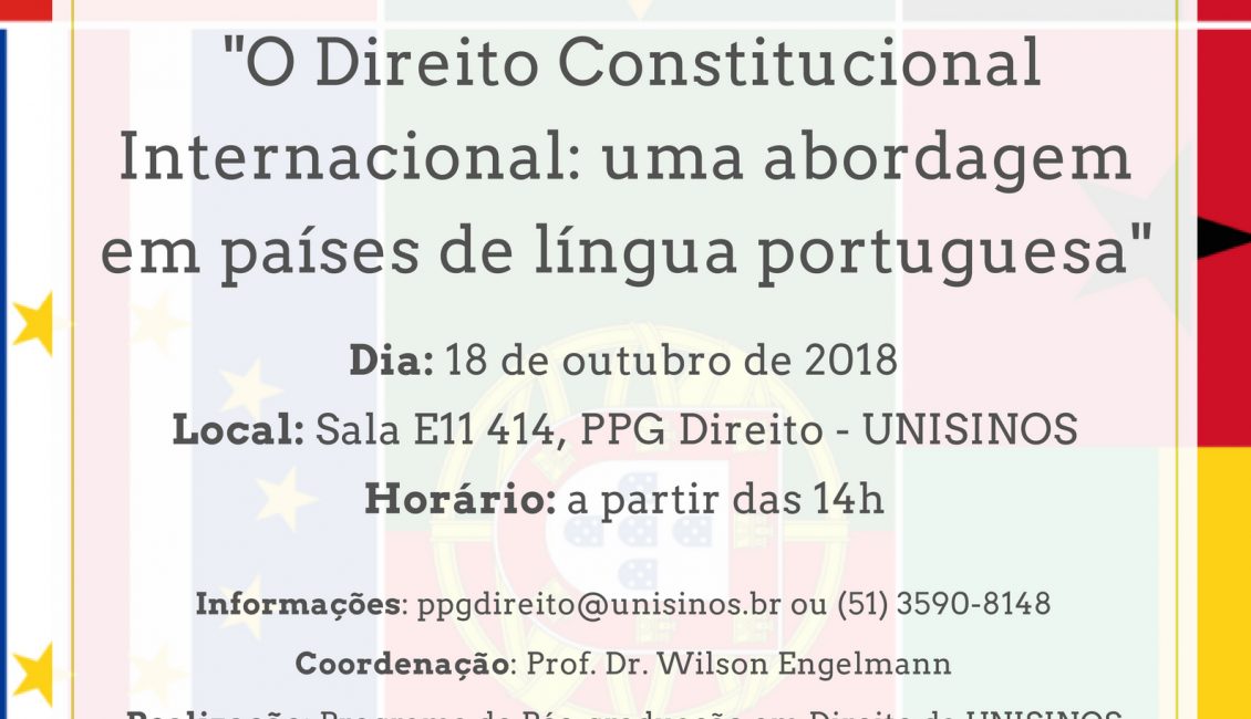 O nosso investigador, o Professor Doutor Jorge Bacelar Gouveia, estará presente, no dia 18 de outubro, no UNISINOS International Law Research. Neste evento, coordenado pelo nosso colaborador e realizado pelo Programa de Pós-graduação em Direito da UNISINOS (Brasil), o Professor Doutor Wilson Engelmann, o Investigador do CEDIS irá apresentar a palestra ‘O Direito Constitucional Internacional: uma abordagem em países de língua portuguesa’.