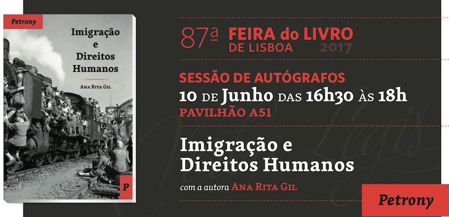 A nossa investigadora, a Doutora Ana Rita Gil, estará na Feira do Livro de Lisboa, no sábado, dia 10 de junho, entre as 16h30 e as 18h, para autografar o seu livro, “Imigração e Direitos Humanos”, à venda nos Pavilhões da Petrony.